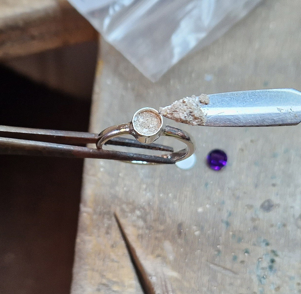 I make the band on its own (if making a ring) and send it to the customer, along with a small container for the ashes and their choice of stone. This a two stage process because once the ashes and stone are set in place, resizing isn't possible, so this gives the opportunity to resize the ring a little if needed.