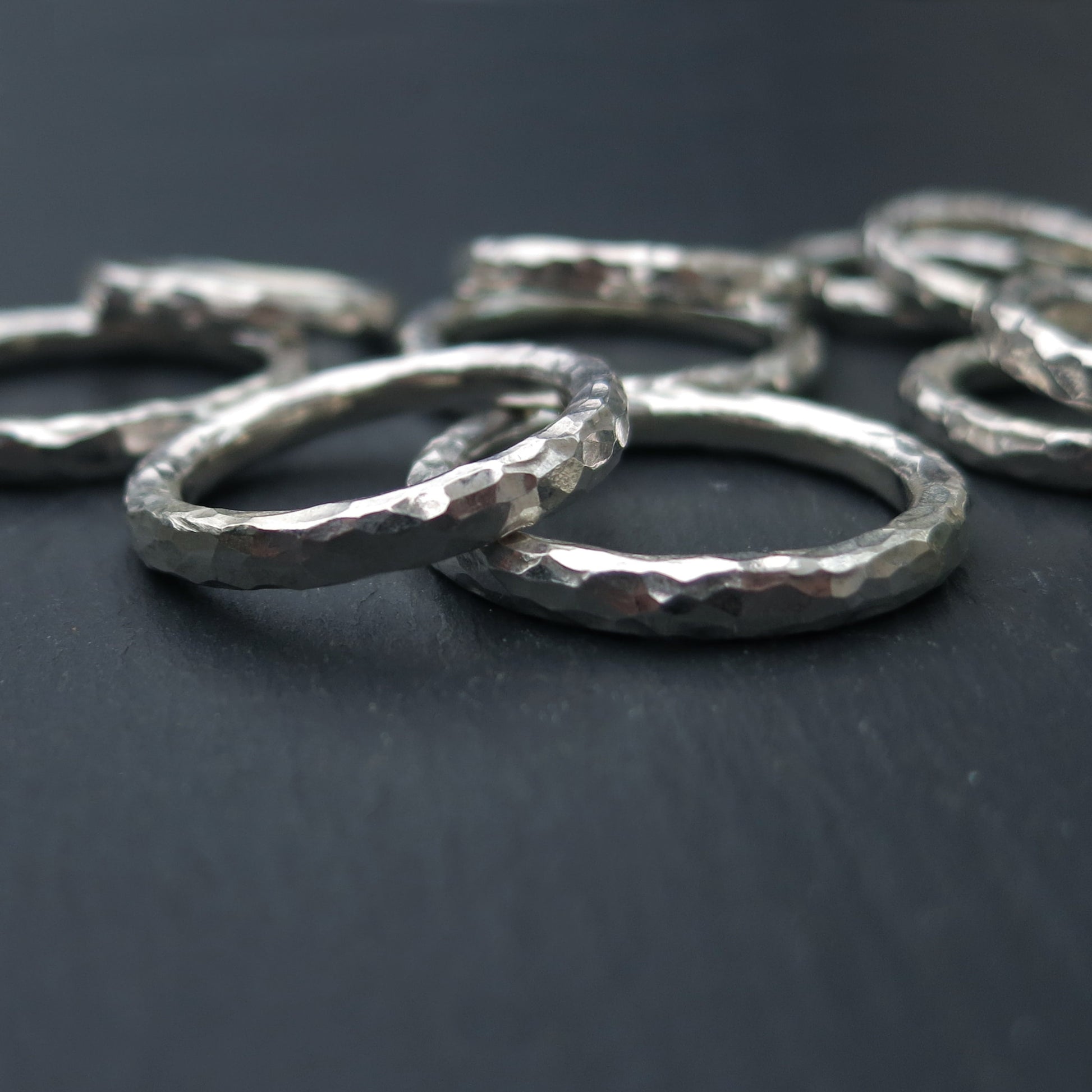These rings have a beautifully sparkly and rustic beaten finish. They have a round 'halo' profile of 3mm wide and 3mm deep. Available in silver, 9ct yellow gold, 9ct rose gold or 9ct white gold - photos currently show silver - photos of gold ones coming soon! When ordering these in gold, please note that I don't keep many in stock, so please allow extra time (at least 3 weeks) as it will likely be made to order and has to be hallmarked in London before I can post to you. Please also note that I do not rhodium-plate my white gold, which means that it will look slightly more grey/yellow in colour than the silvery colour of white gold in most high-street shops.