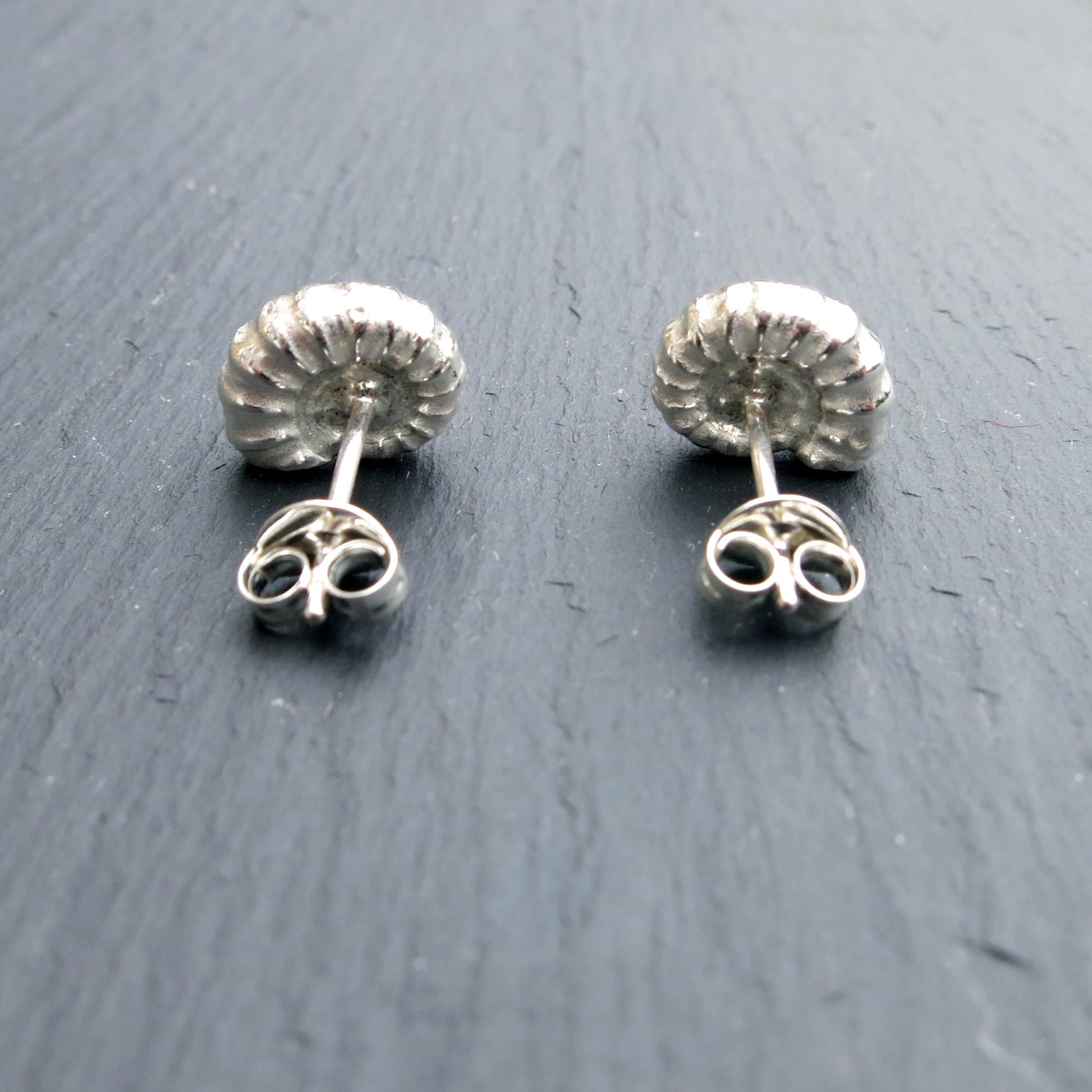 A pair of studs cast from an ammonite found in Lyme Regis, in the heart of the Jurassic Coast. Approx 10mm at widest point. Available in silver, 9ct yellow gold, or 9ct rose gold.